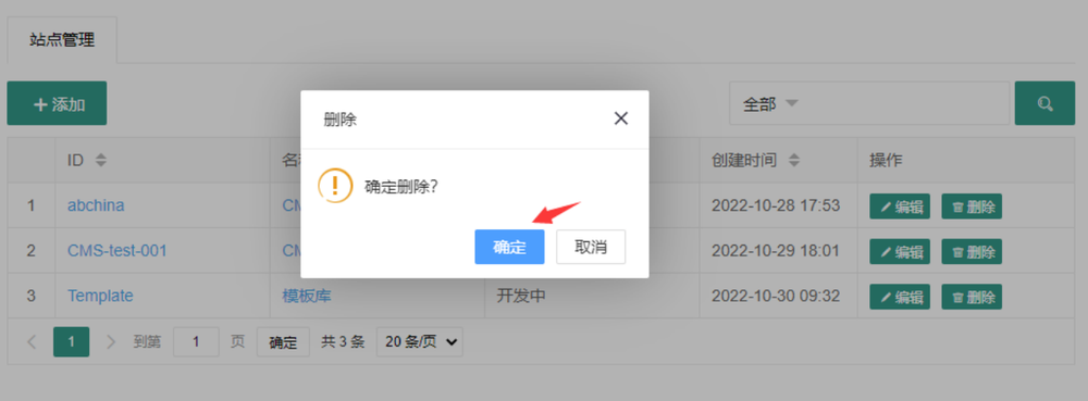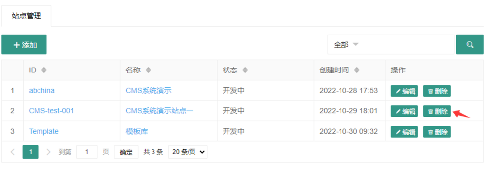 点击站点管理,点击配置站点,列出所有本系统已创建的站点,点击指定站点后面的删除可对站点进行删除:
