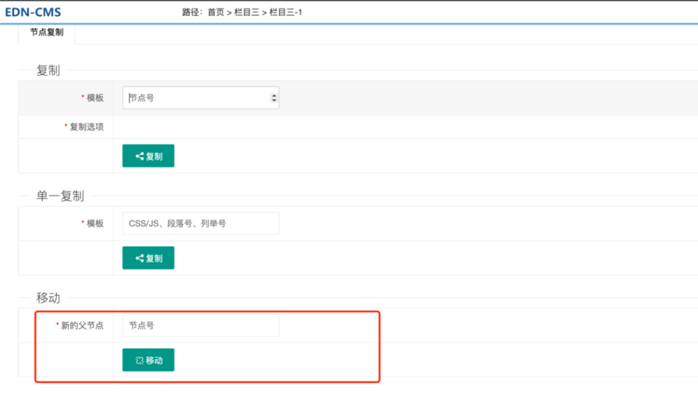 在打开的新界面中,输入要移动到的新的父节点,提提交,则可以把该栏目所有内容,包括栏目首页一起移动到指定的新的栏目节点下