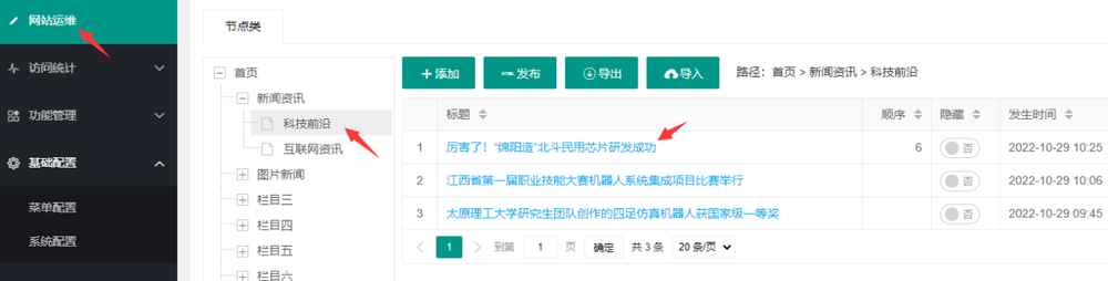 管理员登录系统后,进入到默认站点管理后台,定位到网站运维菜单,打开指定栏目,可以查看一该栏目下的文章列表,点击文章标题,即可对文章进行预览,预览所见页面也发布后一致。