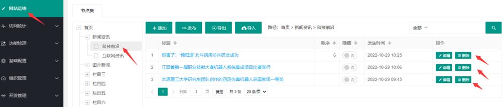 管理员登录系统后,进入到默认站点管理后台,定位到网站运维菜单,选择指定文章栏目后列出该栏目下所有文章,点击指定文章后面的删除,要对文章进行删除操作。
