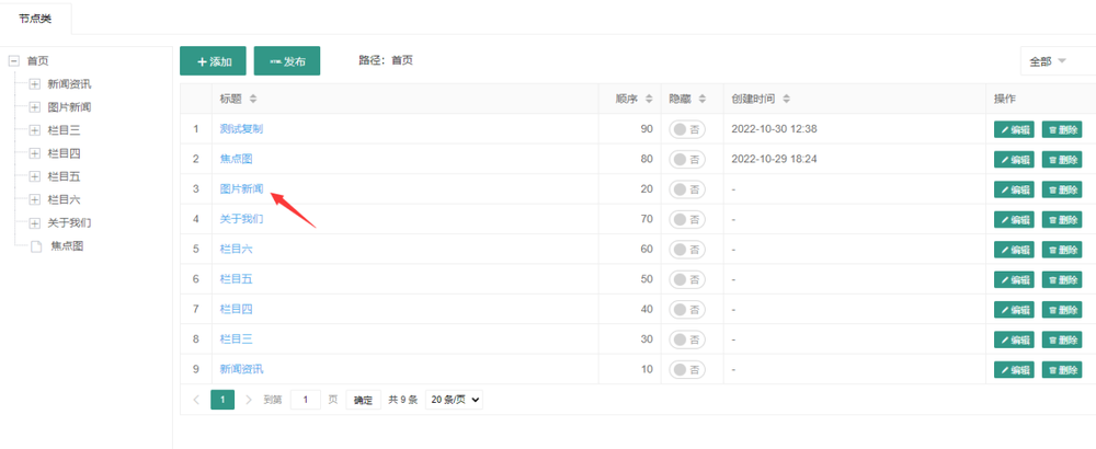 列出所有本站点,已创建的栏目,点击指定栏目的名称,进该栏目的前台页面