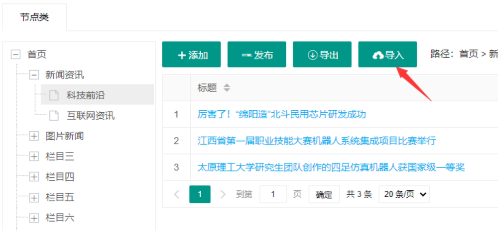 导入时只能选择导出的JSON压缩包进行导入,系统会自动上传压缩包,并自动解压缩后导入,导入时,需要定位到需要导入的节点下。导入会完整生成新的内容,不会覆盖已存在的网站内容。