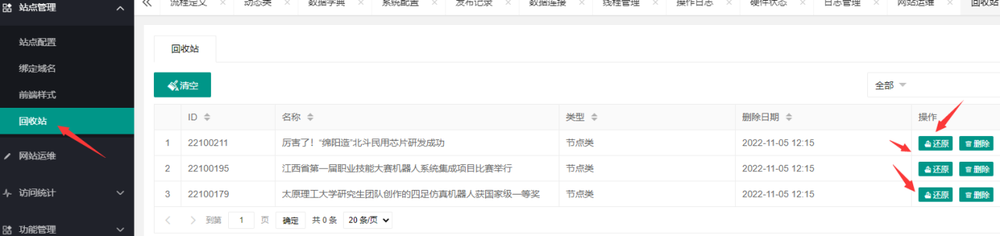 管理员登录系统后,进入到默认站点管理后台,定位到站点管理下面的回收站菜单,回收站中列出所有类型的已删除内容,可按类型、名称、ID、删除日期进行筛选,找到指定模板元素后点击后面的删除按钮,可将模板元素彻底删除。