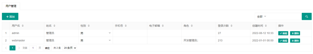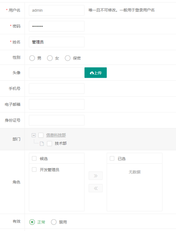 可指定用户的角色(角色决定了用户在管理后台能使用哪些菜单,再通过菜单的配置实现基础的权根管理)