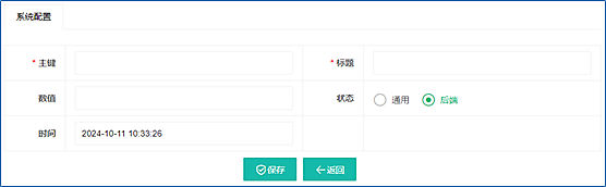 点击“添加”,在新窗口中,录入主键、标题、数值、设置状态为通用/后端;时间默认为当前提交时间,设置完成后,点击“保存”提交: