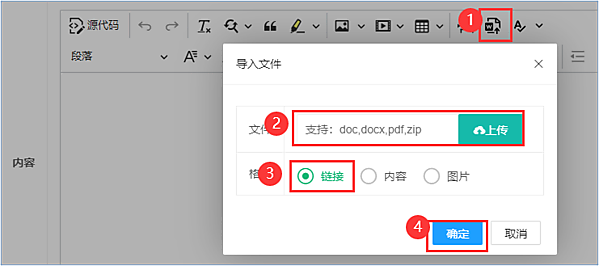 在文章管理详细页,点击“导入word/pdf”,选择上传PDF文档,导入后获得pdf地址: